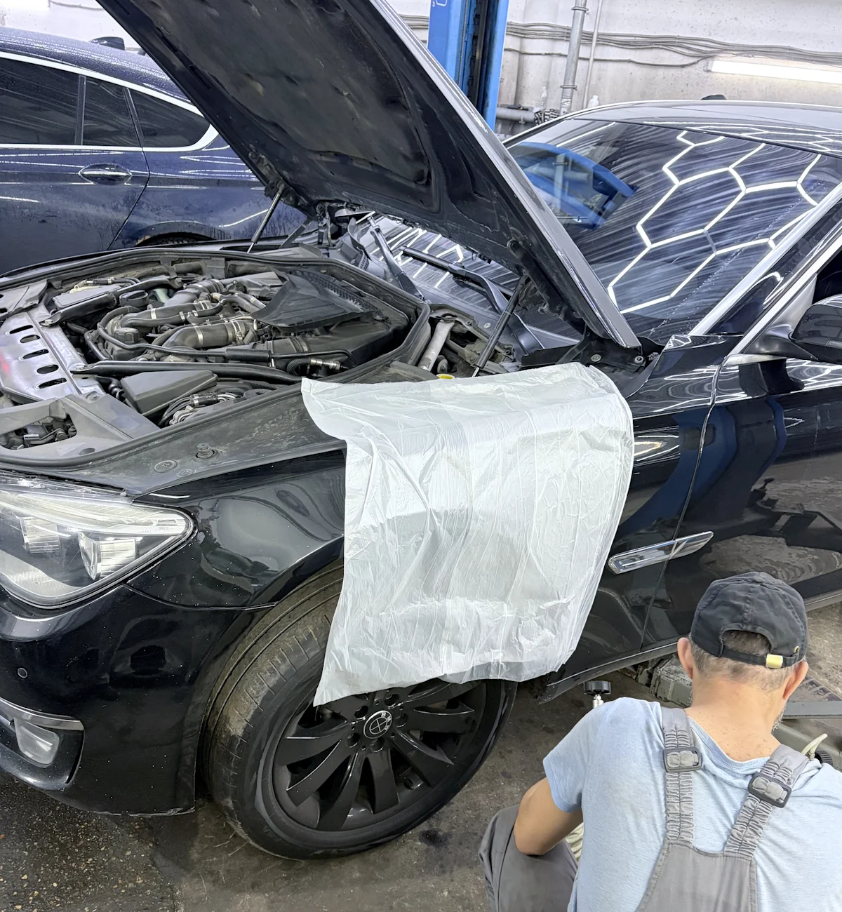 На данном BMW 750Li xDrive F02 необходимо было сделать замену масла в 4.4-литровом бензиновом двигателе N63, замену воздушного и салонного фильтров, а также провести комплексную диагностику. Во время комплексной диагностики было проверено состояние подвески, тормозной системы, рулевого управления и других узлов автомобиля, течей рабочих жидкостей обнаружено не было, а диагностика автоэлектрики необходима была для считывания и расшифровки ошибок с их последующим сбросом.