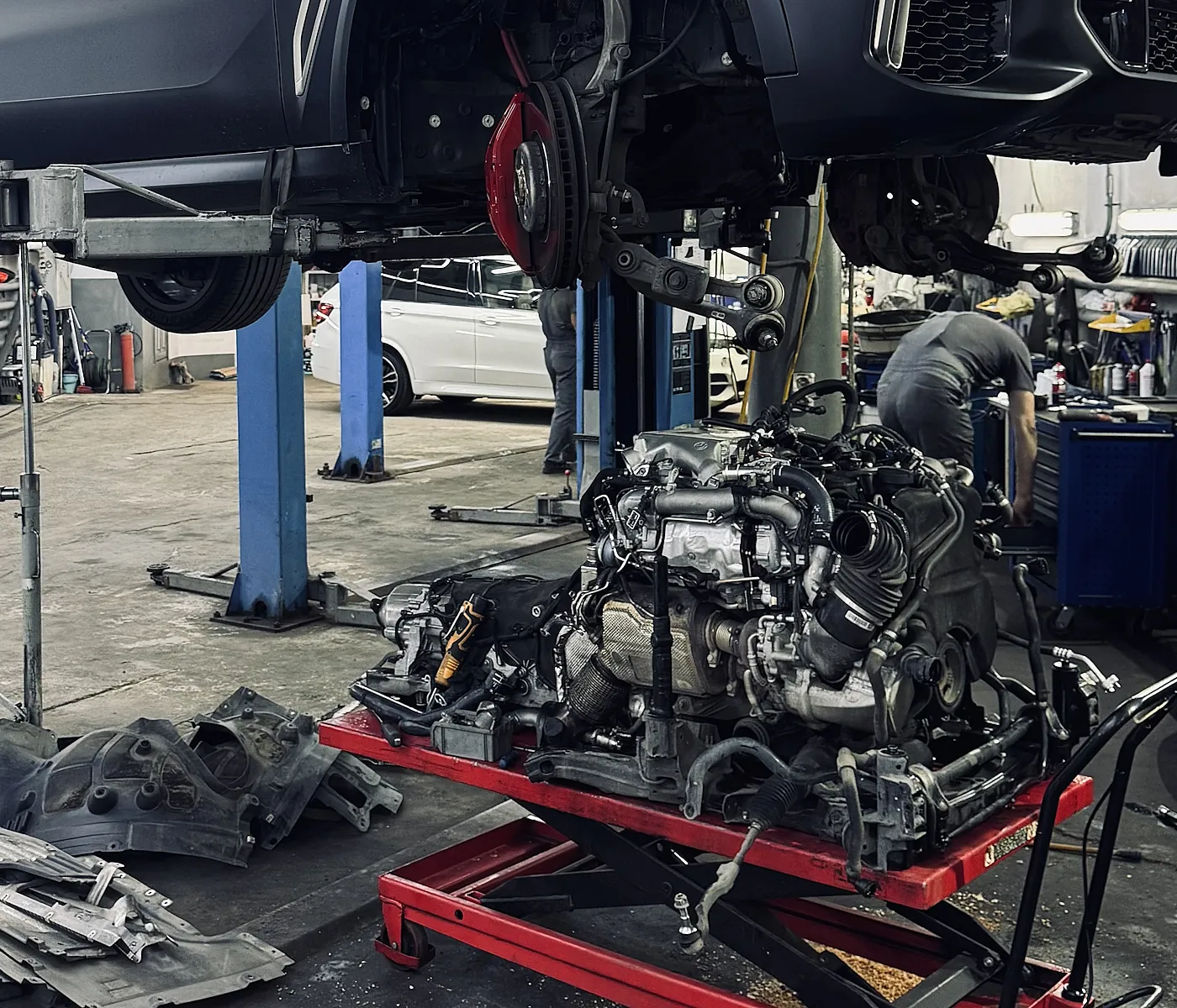 Спортивный кроссовер BMW X5 M50d G05 оснащен 3-литровым дизельным турбомотором B57, который требует своевременного и качественного обслуживания, а также грамотной диагностики и ремонта специалистами. На данном X5 M50d пробег на момент обращения составлял почти 130 тысяч км, со слов автовладельца стал часто загораться “чек” с уведомлением о потере мощности двигателя. Во время диагностических мероприятий был обнаружен ряд неисправностей, основной из которых являлась неисправная подключающая заслонка турбонагнетателя высокого давления, для её замены из-за особенностей конструктивного исполнения мотора потребовалось снятие/установка силового агрегата.